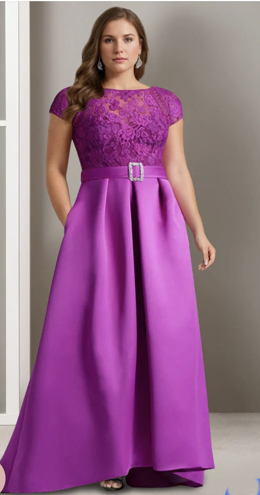 A bold celebration of colour in radiant violet satin, balanced with a lace bodice and capped sleeves. The crystal-buckled belt defines the waist while soft pleats create fluid movement. A chic yet statement-making design.