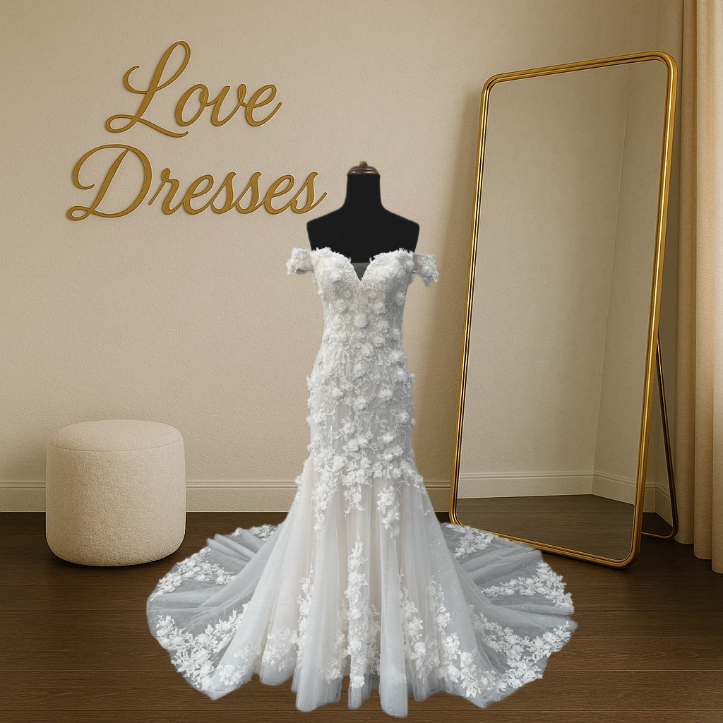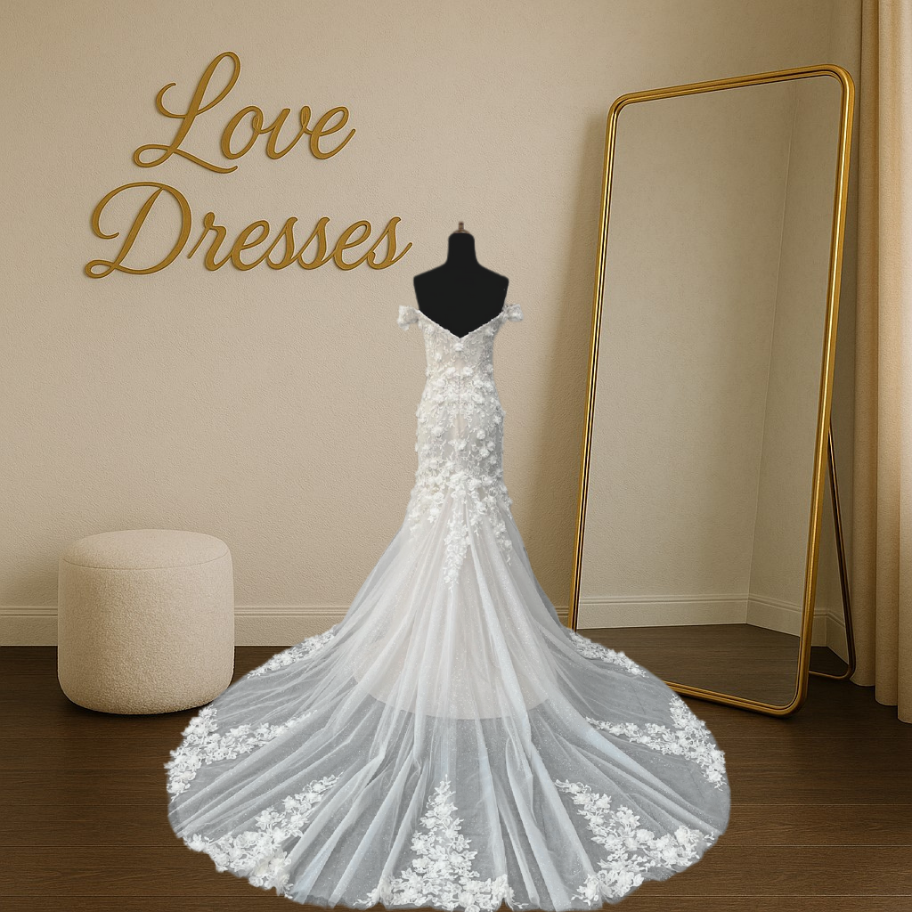 mermaid gown features a 3D floral lace that blossoms across the bodice and spills down the skirt. The sweetheart neckline and off-the-shoulder sleeves highlight the collarbone, while the illusion back and flowing train bring ethereal magic.
