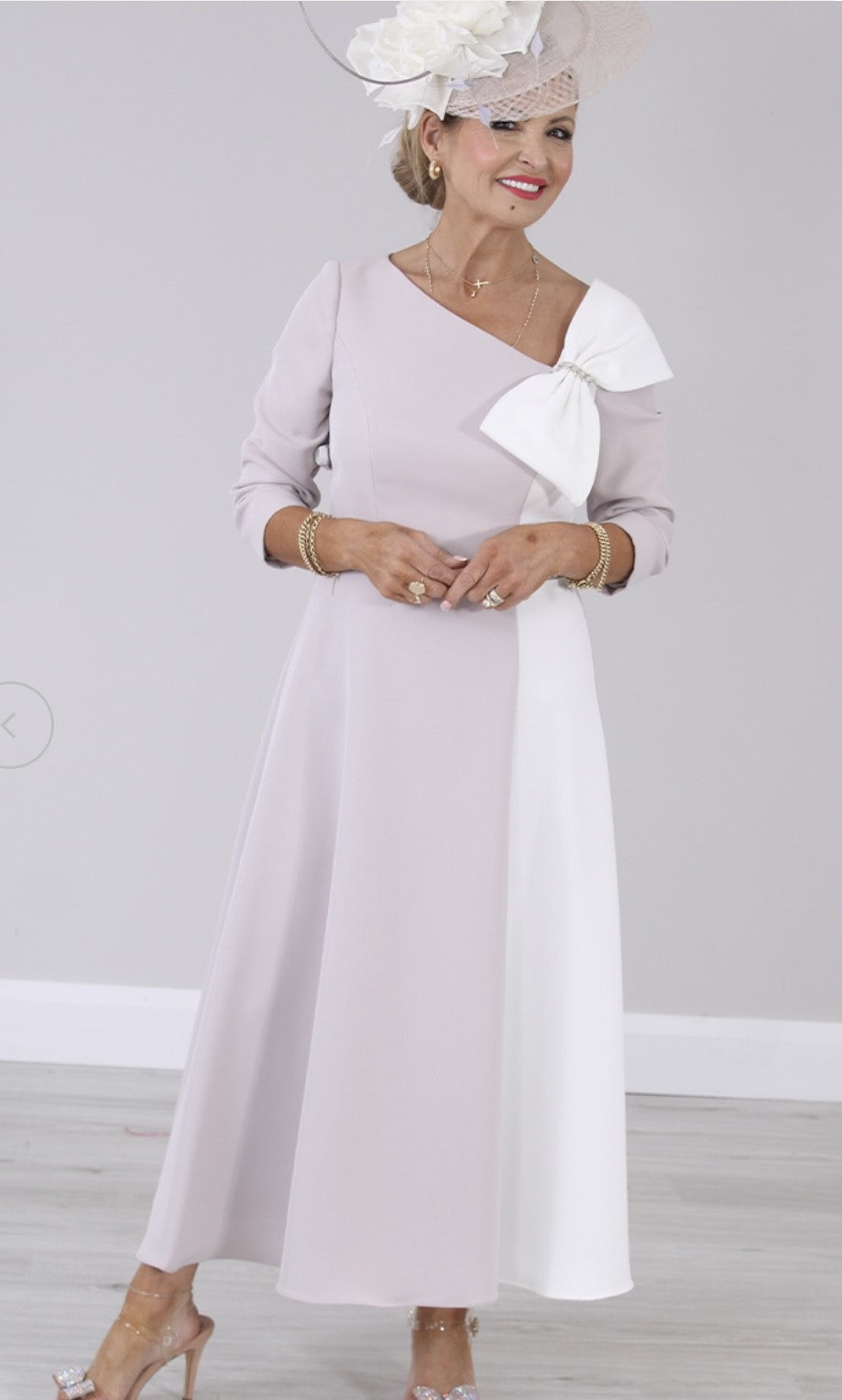 Timeless elegance with a playful twist — this blush and ivory midi dress features a soft A-line silhouette, three-quarter sleeves, and a flattering asymmetric neckline. A statement bow detail at the shoulder, finished with subtle embellishment, adds a touch of modern charm. A perfect choice for weddings, special occasions, and sophisticated daytime events.
