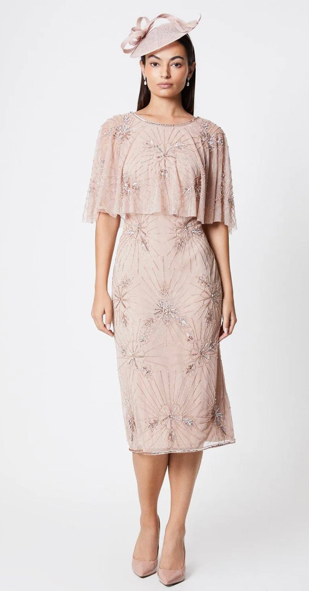 Delicately beaded in starburst patterns, this blush midi dress exudes understated glamour. The sheer cape overlay adds soft movement and coverage, while the fitted silhouette ensures a flattering finish. Perfect for weddings, cocktail receptions, and elegant occasions.