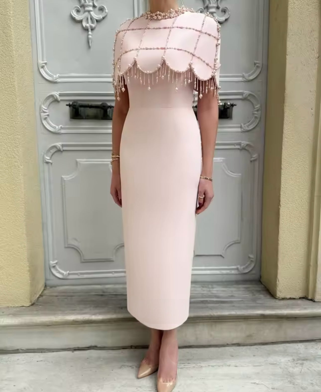 Striking in its simplicity, this blush midi dress is elevated by a statement beaded cape overlay. The sleek column silhouette creates a modern, refined look, while the pearl and crystal detailing across the shoulders adds movement and shimmer with every step. A perfect choice for weddings, black-tie occasions, and unforgettable evenings.