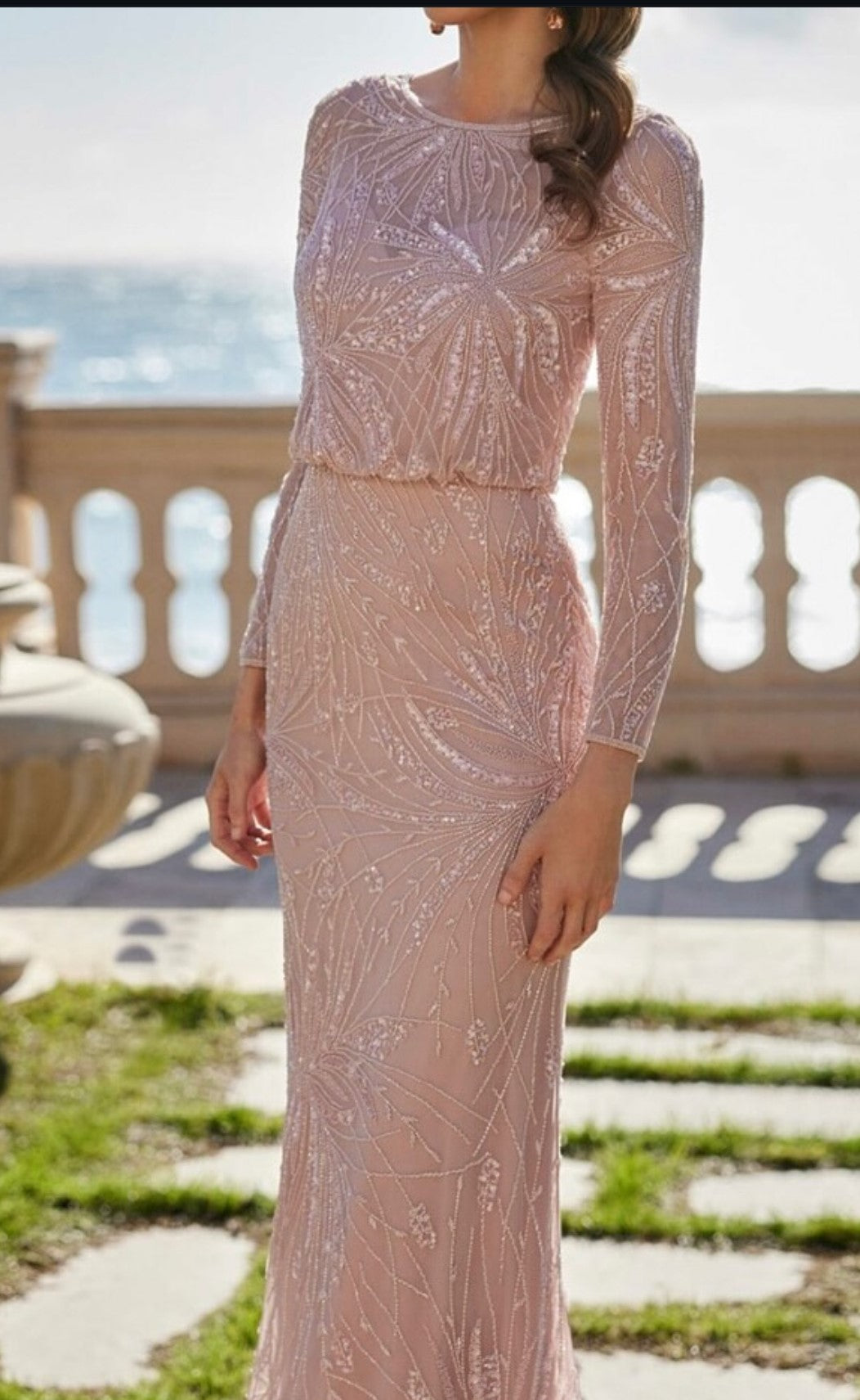Intricately hand-beaded, this blush gown shimmers with elegance. Featuring sheer long sleeves, a soft blouson bodice, and a figure-skimming skirt, it’s the perfect blend of sophistication and modern glamour. Ideal for evening occasions or standout special events.