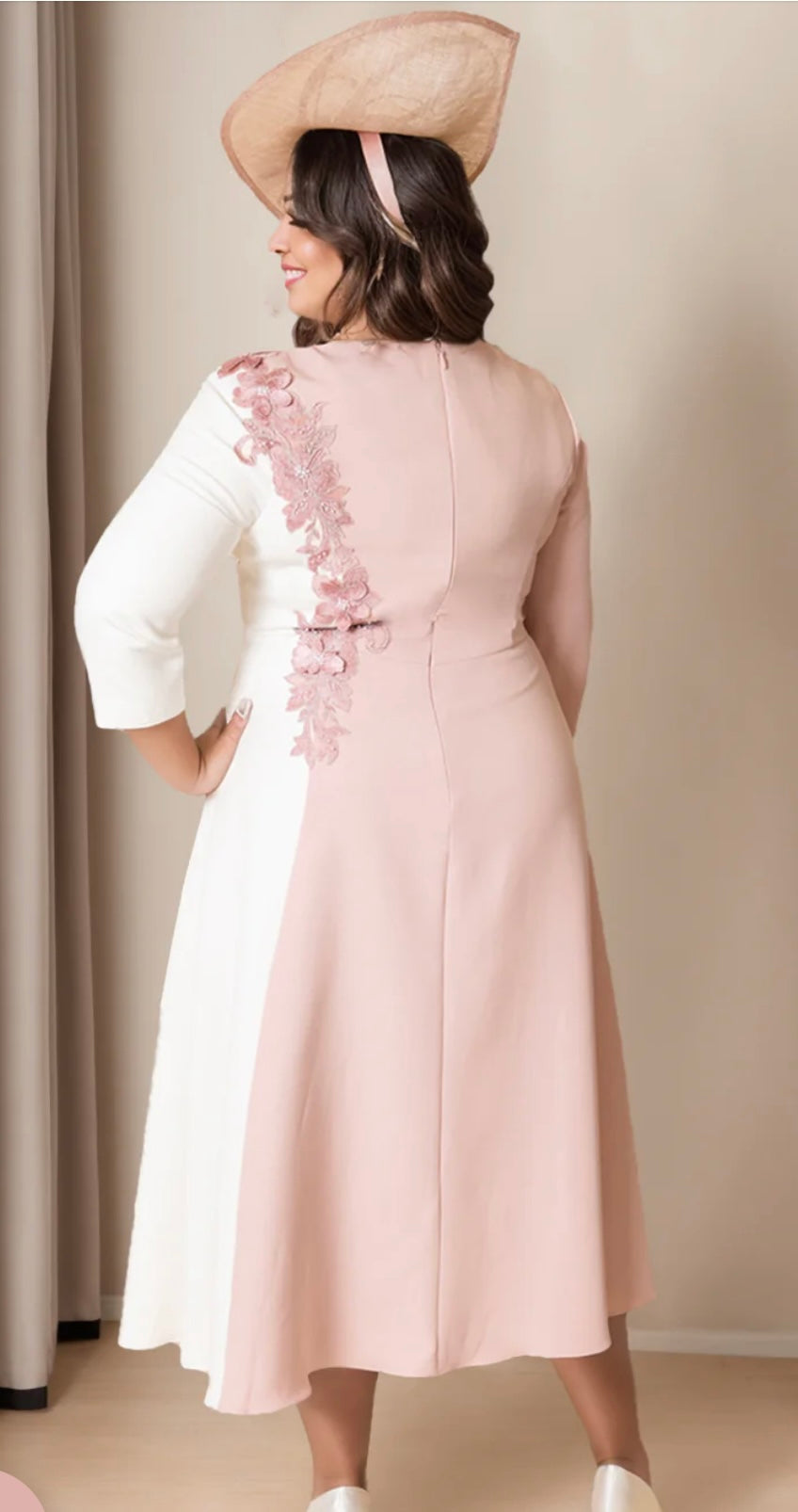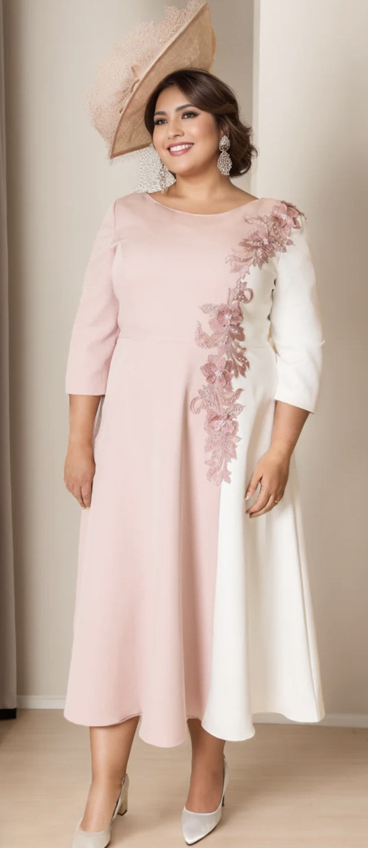 A modern take on occasion elegance — this blush and ivory midi dress features a flattering fit-and-flare silhouette with three-quarter sleeves. The two-tone design is elevated by delicate floral appliqué detailing that cascades along the bodice, adding softness and charm. A refined choice for weddings, celebrations, and special events.