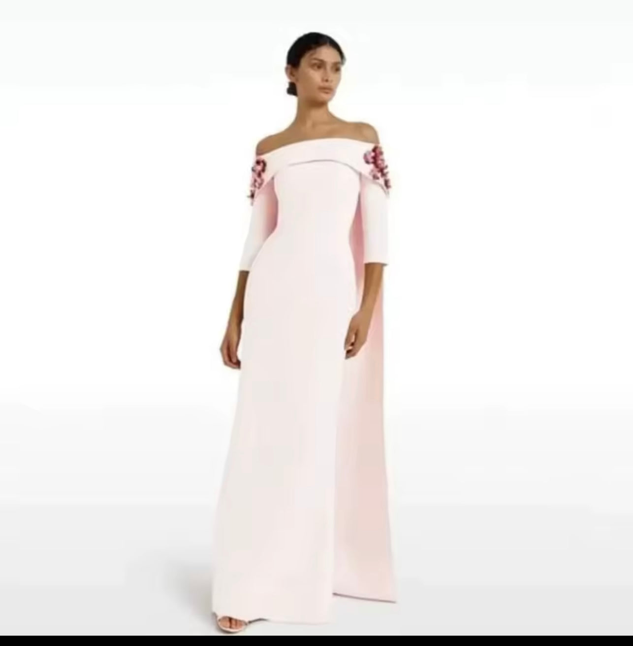 Sophistication in its purest form — this blush off-shoulder gown is designed with clean, sculpted lines that elongate the silhouette. Delicate floral embellishments at the sleeves add a touch of romance, while the structured cape-back detail ensures a graceful, modern finish. Elegant, refined, and effortlessly chic — a perfect choice for black-tie evenings, weddings, or standout occasion wear.