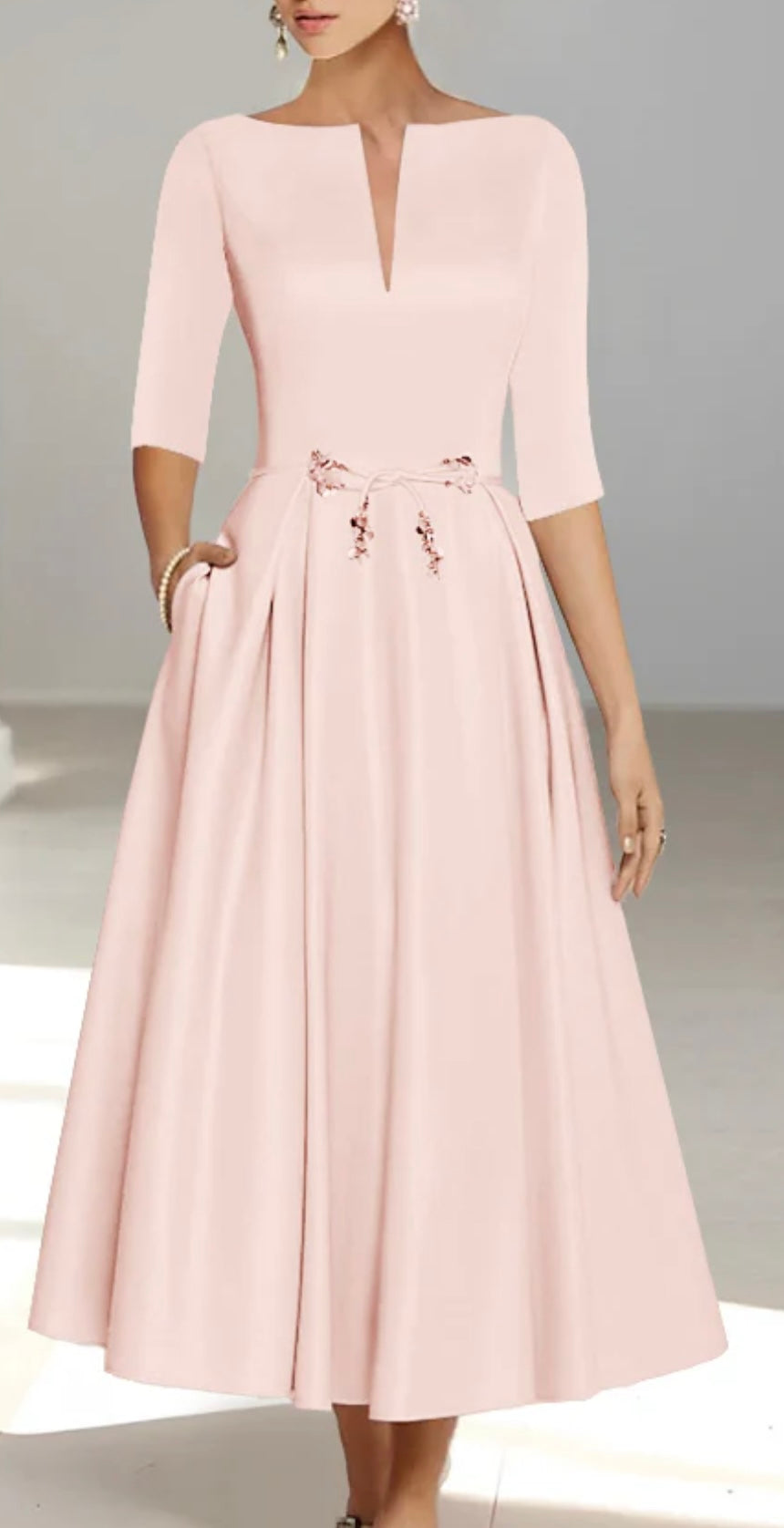 Simple yet sophisticated, this blush midi dress features a flattering notched neckline, three-quarter sleeves, and a softly pleated skirt for graceful movement. Subtle floral embellishments at the waist add a touch of detail while maintaining a timelessly elegant look. Perfect for weddings, formal daytime occasions, or Mother of the Bride style.