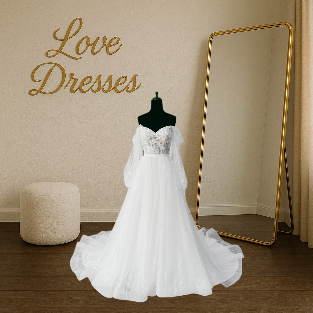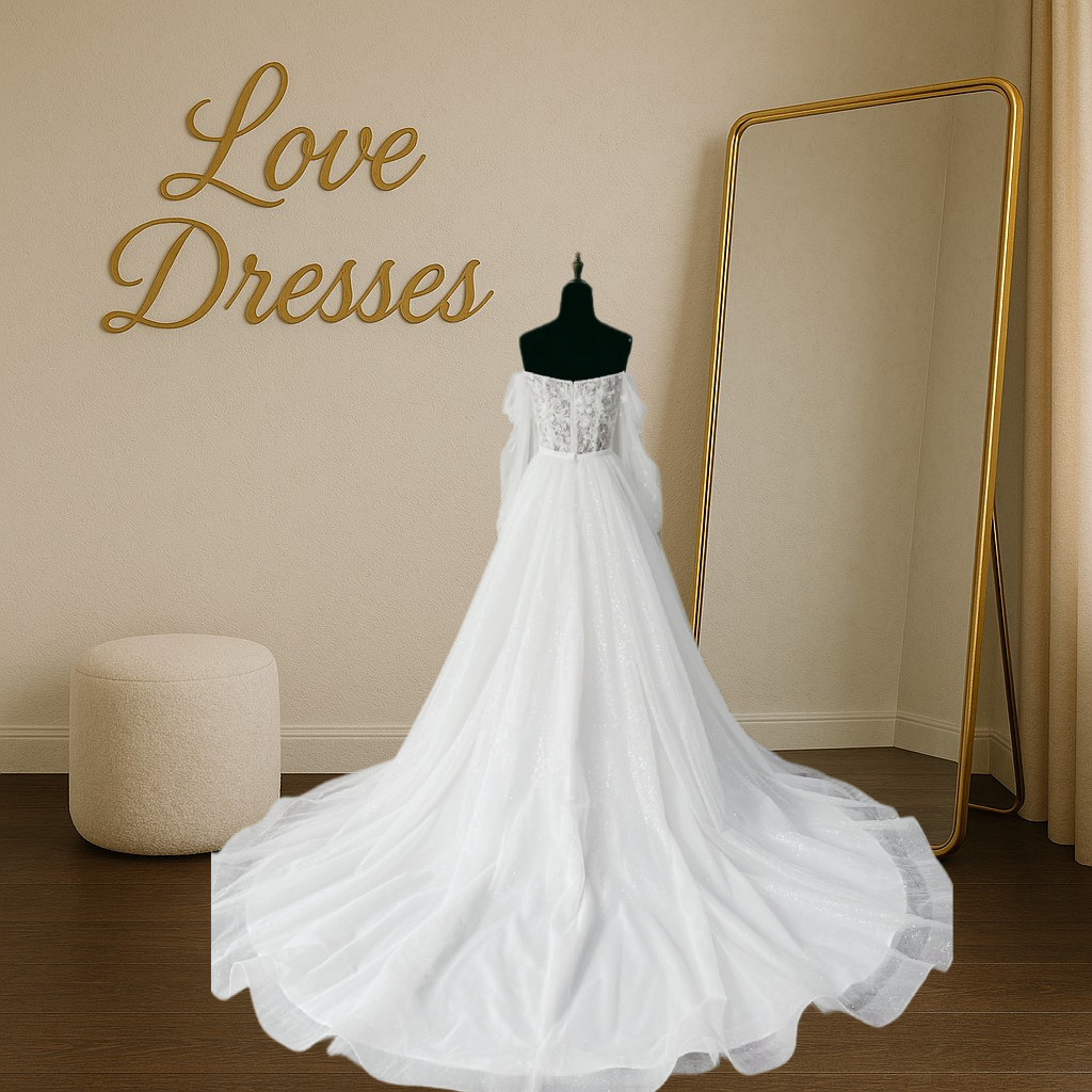 detachable full-length overskirt, creating a voluminous ballgown silhouette that glimmers with every step. From aisle to after-party, Celina lets you shine in two completely captivating looks—without ever having to change.