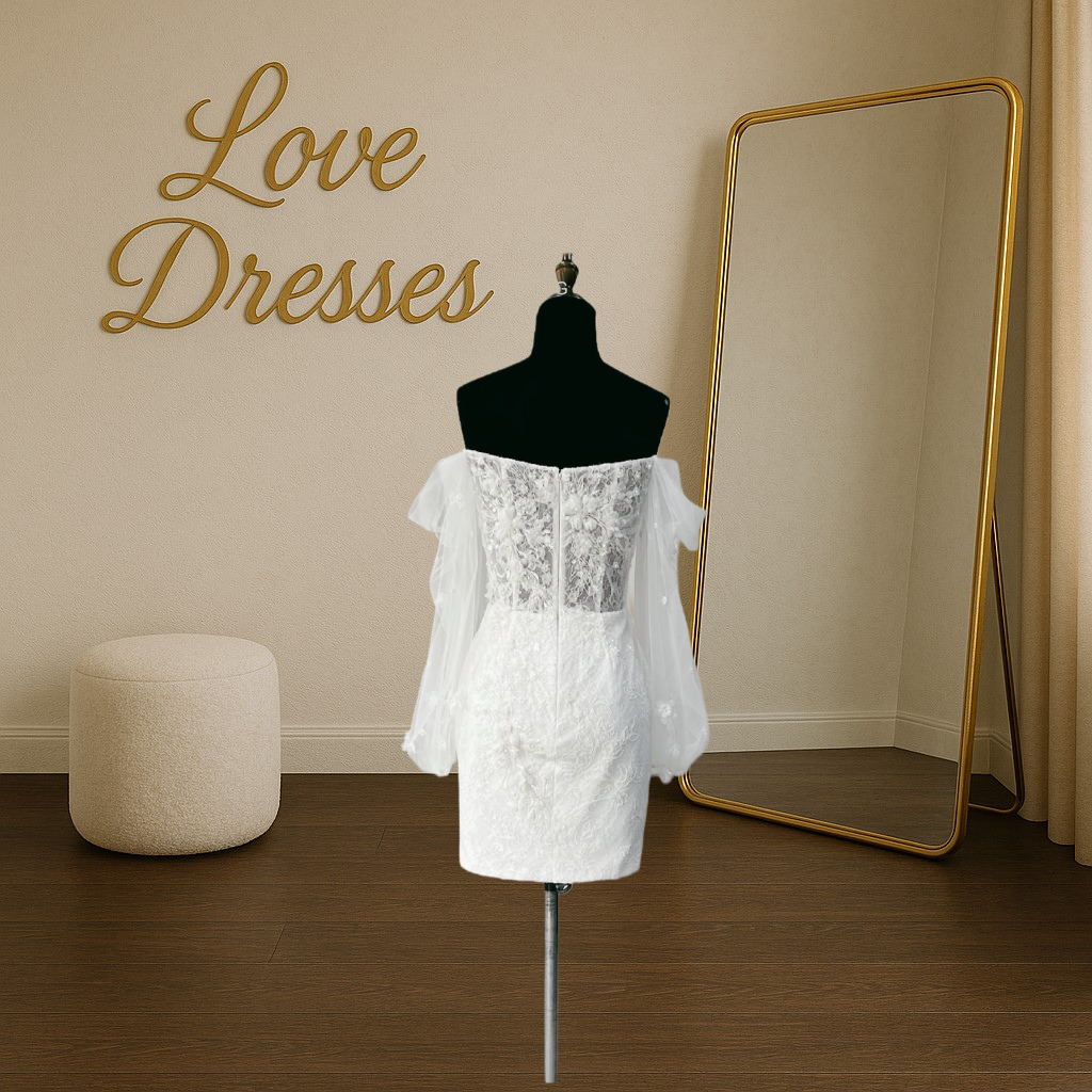 chic, fitted mini dress crafted in embroidered lace and illusion tulle, complete with soft off-