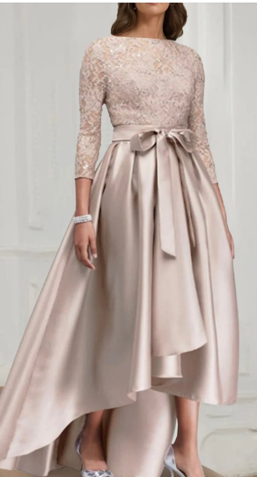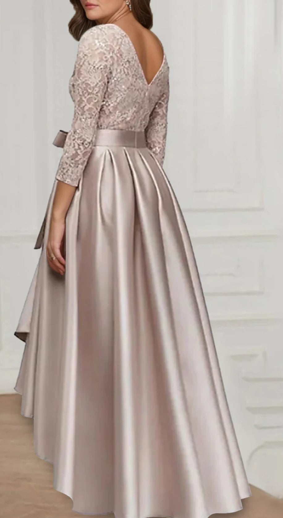 Romantic and elegant, this champagne gown features a delicate lace bodice with three-quarter sleeves and a flattering V-back. The satin skirt falls in soft pleats with a high-low hemline for graceful movement, finished with a statement bow at the waist. A timeless choice for weddings, evening occasions, or Mother of the Bride style.