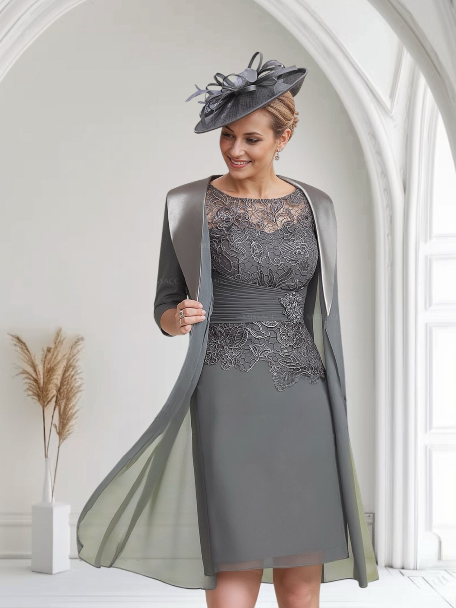 Elegant and timeless, this charcoal dress is designed with a fitted lace bodice and ruched waist for a flattering shape. The flowing chiffon jacket, finished with satin lapels, adds polish and movement, making it an ideal choice for Mother of the Bride or Groom style.