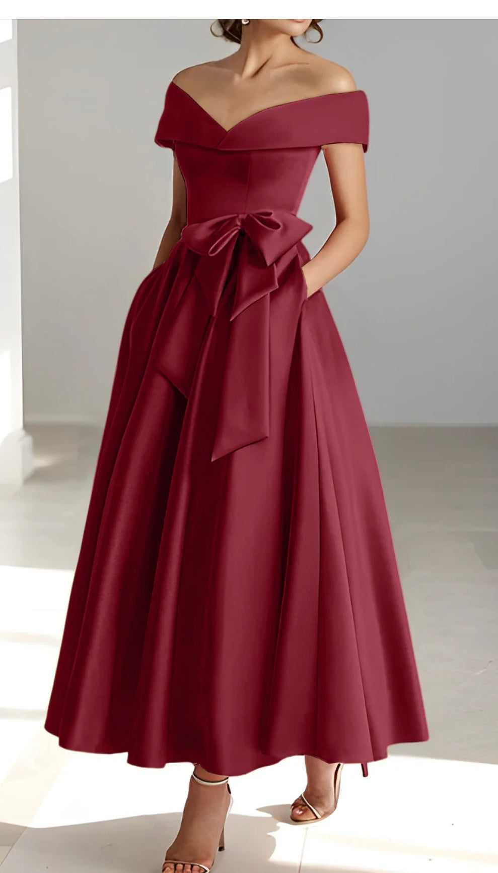 A deep red satin masterpiece, shaped with a structured off-shoulder neckline and finished with an oversized bow at the waist. Its full A-line skirt drapes beautifully, blending playful femininity with evening sophistication.
