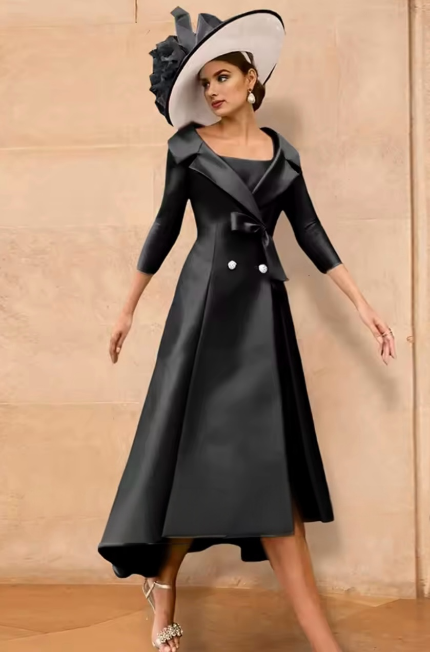 A striking black fit-and-flare dress with a tailored silhouette. The wide lapel neckline, structured bodice, and flared hemline offer a sharp yet feminine statement. Finished with crystal buttons and a satin bow accent.