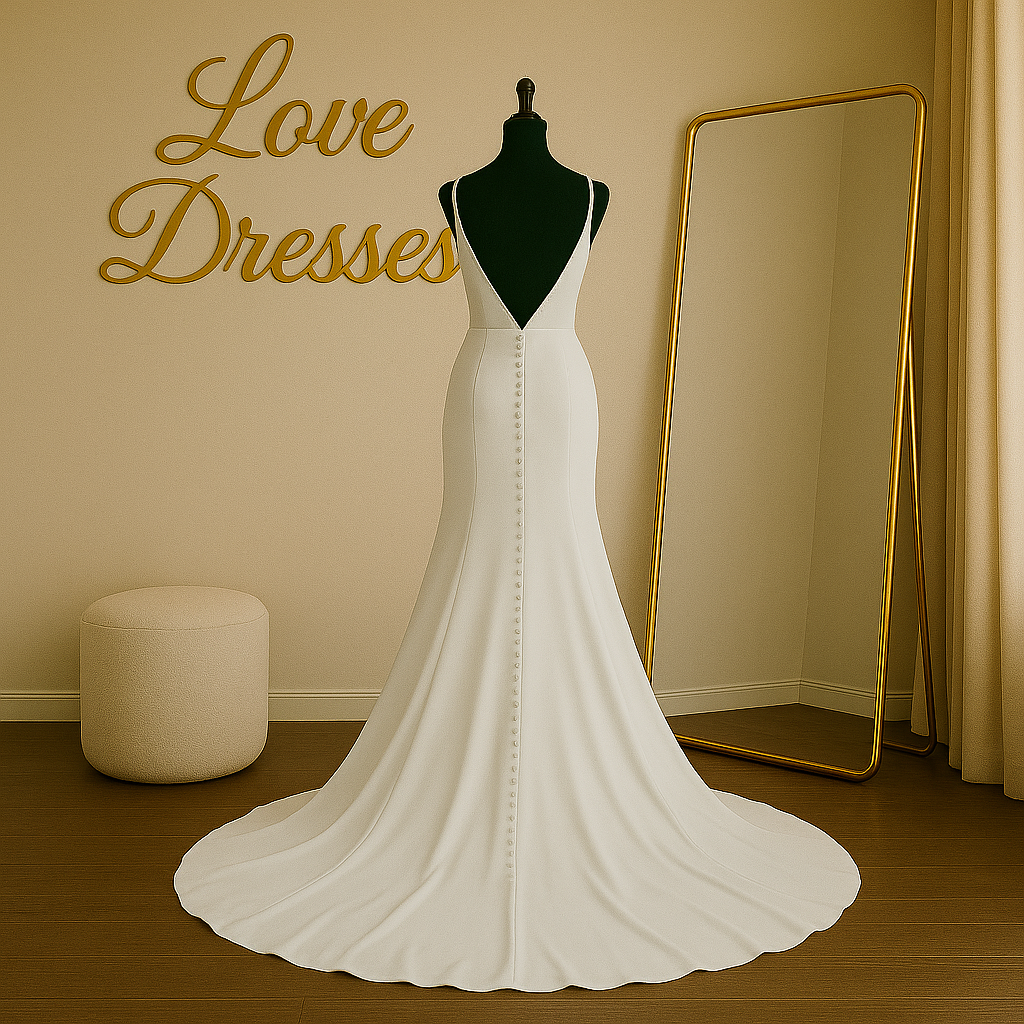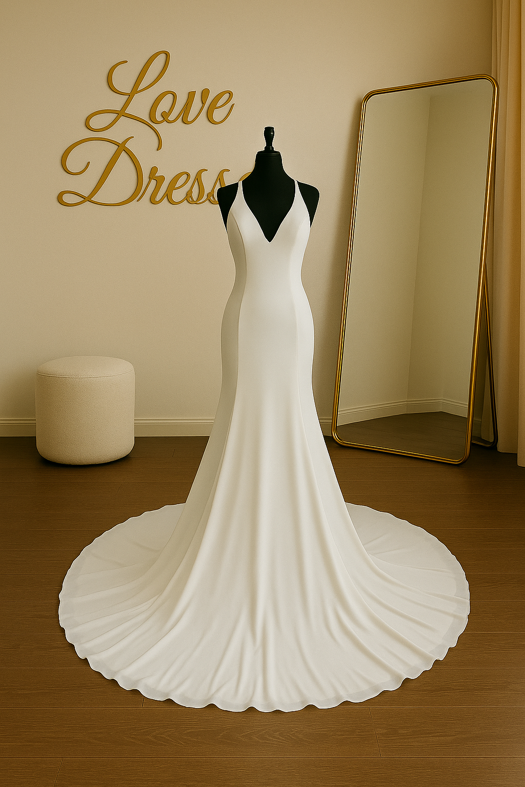 Elara embodies the allure of pure form. With a plunging halter neckline and sleek silhouette, this gown flows into a soft, sweeping train for an ethereal finish. Covered buttons cascade down the back, adding a timeless detail to its contemporary shape. Crafted from fluid crepe, Elara moves like liquid light—perfect for the bride who defines elegance on her own terms.