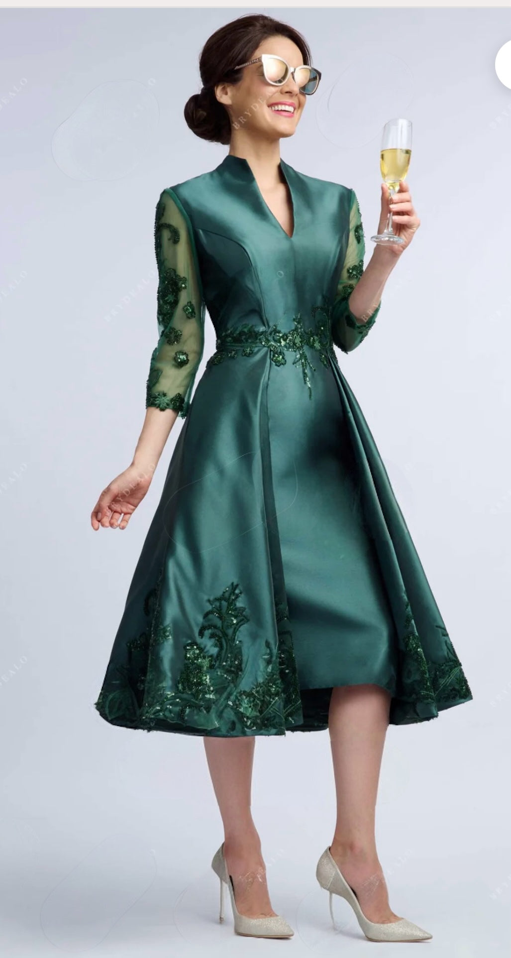 A glamorous emerald green midi dress with a structured bodice and flared skirt. Sheer embroidered sleeves and intricate detailing along the hemline elevate its couture finish. A dress designed to dazzle at any special occasion.