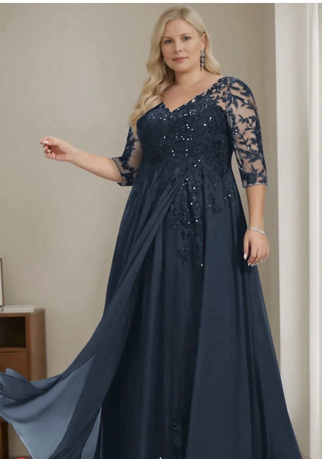 A romantic navy gown adorned with sequin lace appliqué and illusion sleeves. The V-neckline and soft flowing skirt enhance the feminine silhouette, while sheer overlays create graceful movement.