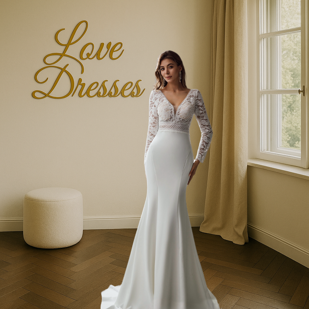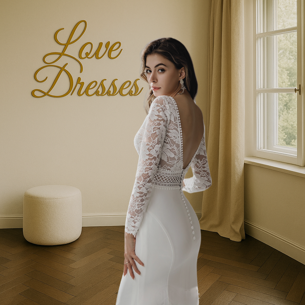 places, while the sheer lace bodice with full-length sleeves brings a vintage elegance.