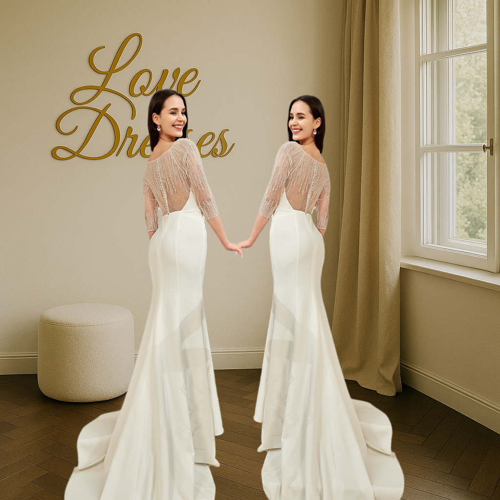 silhouette, this gown embraces the body in crepe perfection. The sheer beaded sleeves add