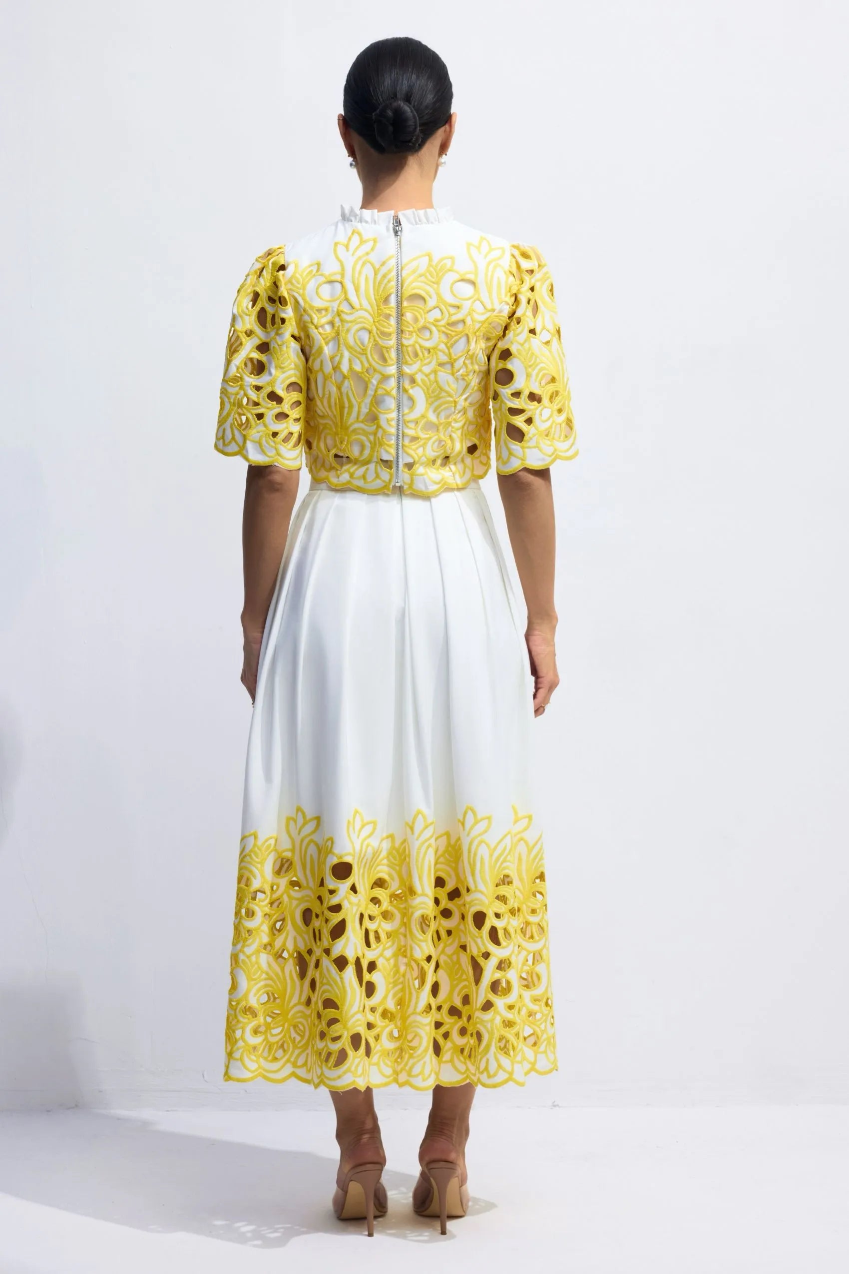 Turn heads in Kelly Two-Piece, a bold yet graceful ensemble that blends sunshine and sophistication. Featuring a structured yellow embroidered overlay top with scalloped sleeves and a high neck, paired with a pleated white midi skirt adorned with matching embroidery along the hem — this look is all about elevated impact. Fresh, refined, and perfect for summer events, garden parties, or stylish race days.