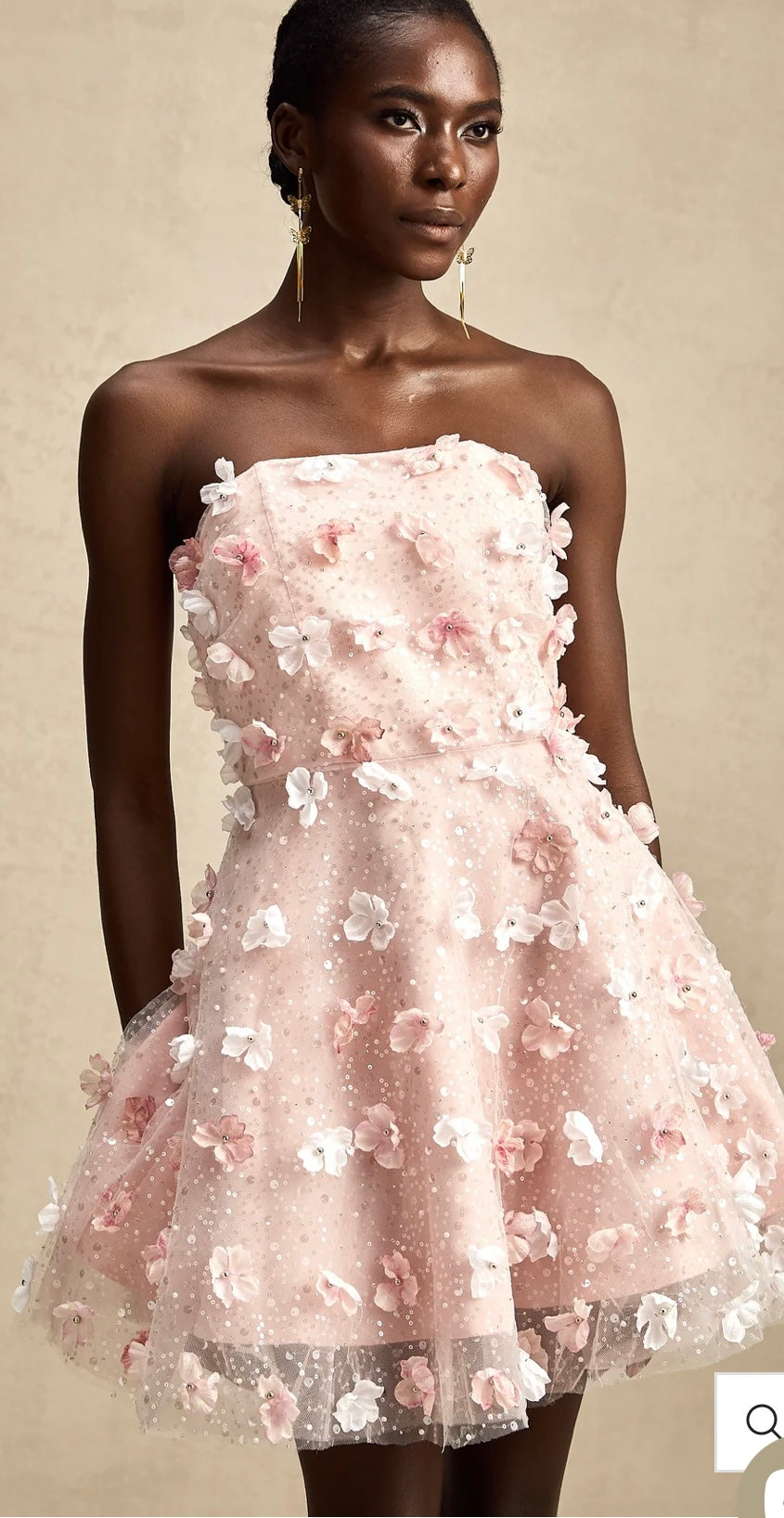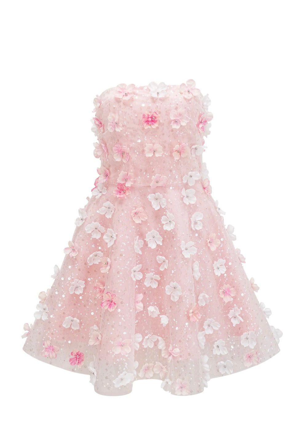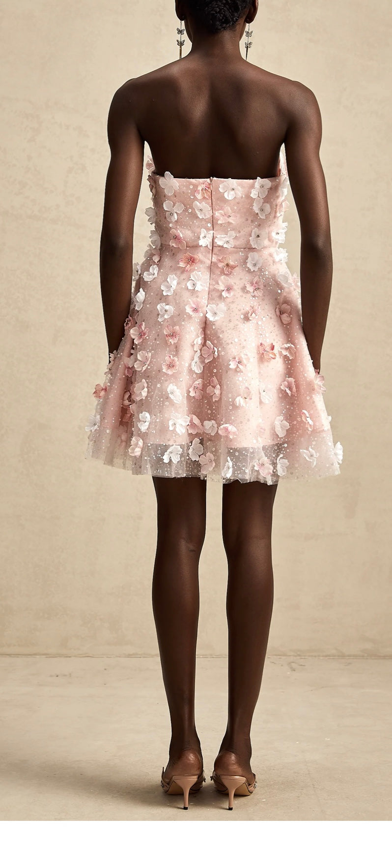 Lilou Petal is pure magic in motion. Crafted in blush pink tulle and sprinkled with hand-sewn 3D floral appliqués, this strapless mini dress captures the essence of playful femininity. Shimmering with subtle sequins and layered for airy movement, it’s the ultimate piece for garden parties, romantic evenings, or making your own fairytale moment.