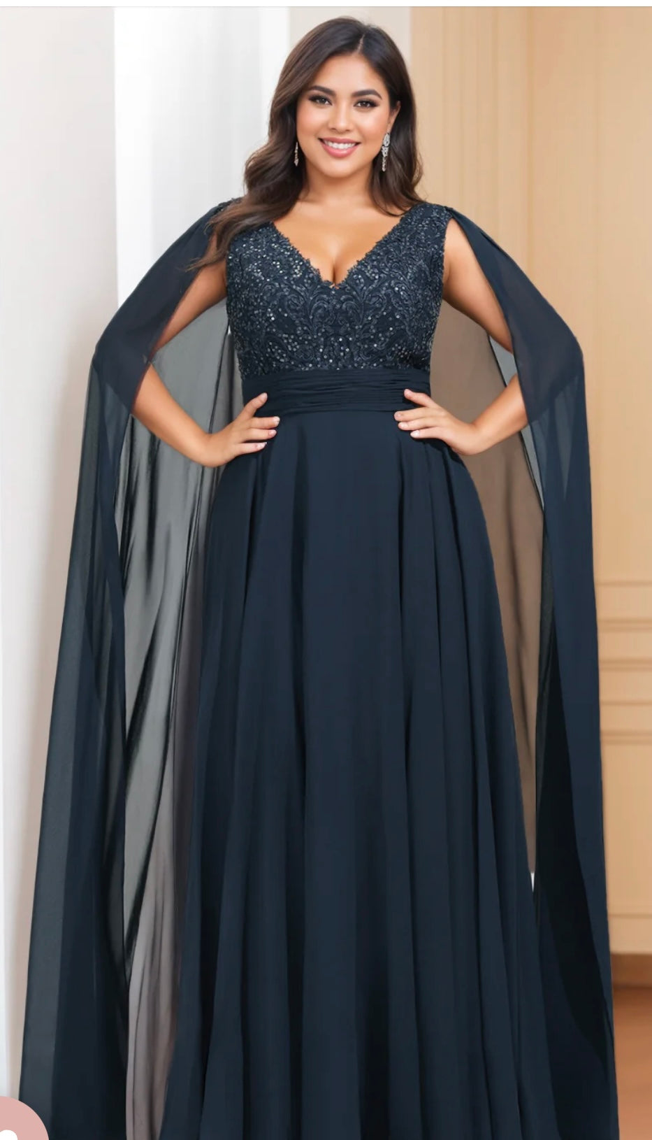 An elegant navy gown featuring a sequin-embroidered bodice with a soft V-neckline. The flowing A-line skirt pairs beautifully with sheer cape sleeves for a look that blends drama and grace. A timeless design that flatters with ease.