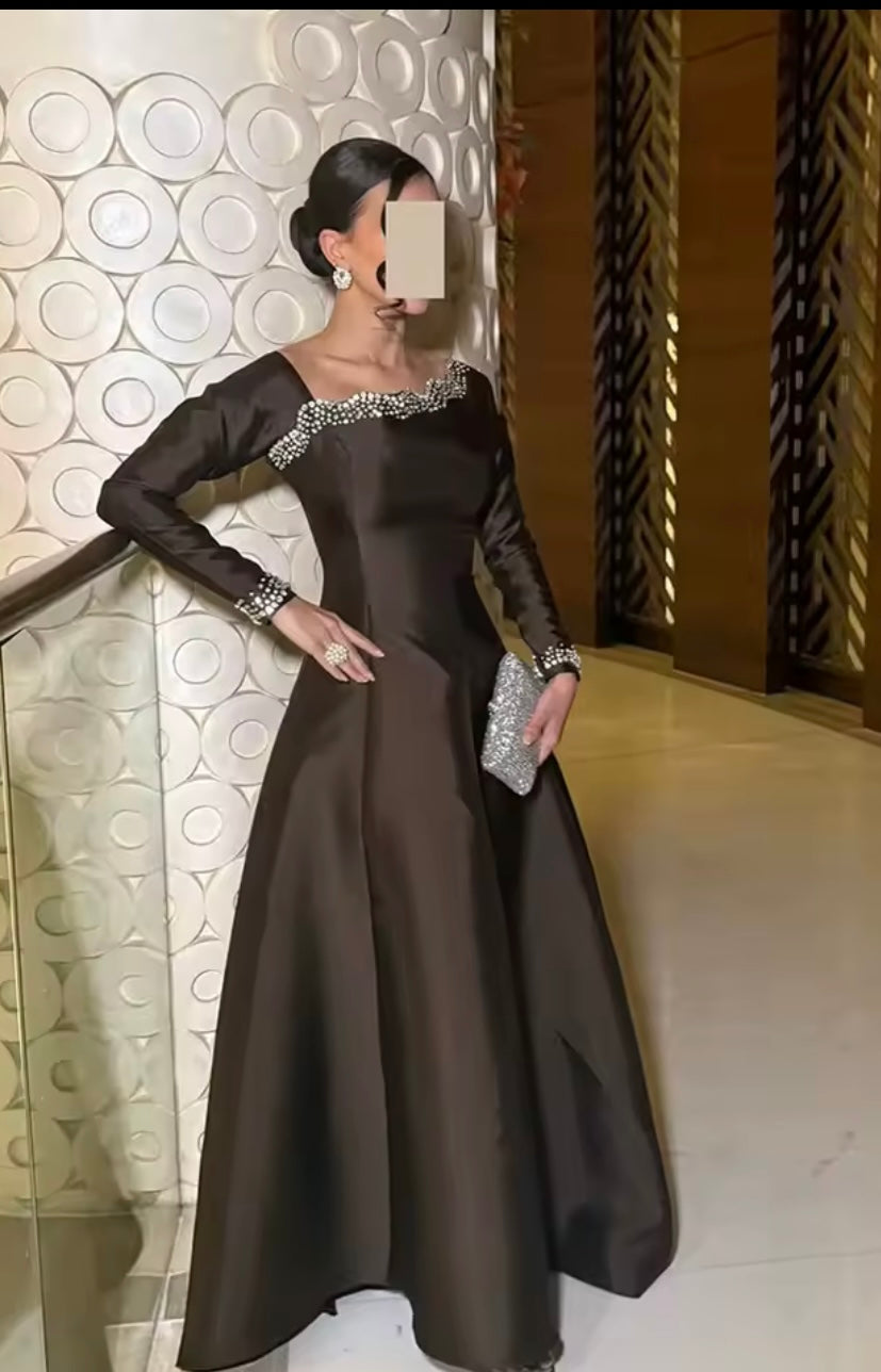 A timeless black satin gown with a fit-and-flare silhouette, designed with long sleeves and a pearl-embellished bateau neckline. The matching pearl detail at the cuffs adds refinement, while the sweeping skirt ensures a regal finish.