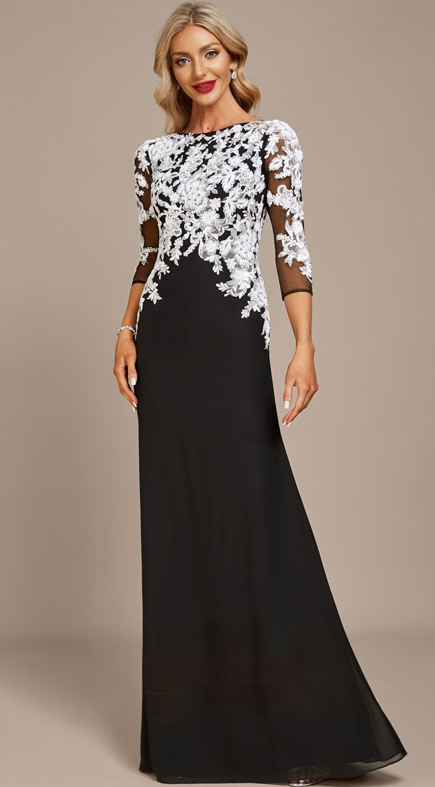 A fitted black gown with delicate white floral embroidery cascading across the bodice and sheer sleeves. The elegant floor-length cut elongates the silhouette, while the intricate lace detailing provides a romantic finish.