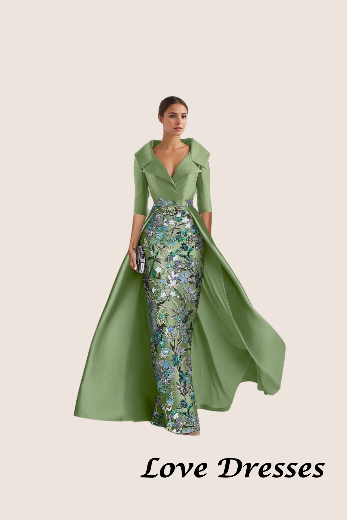 features a structured sage green bodice with a dramatic collar and three-quarter length
