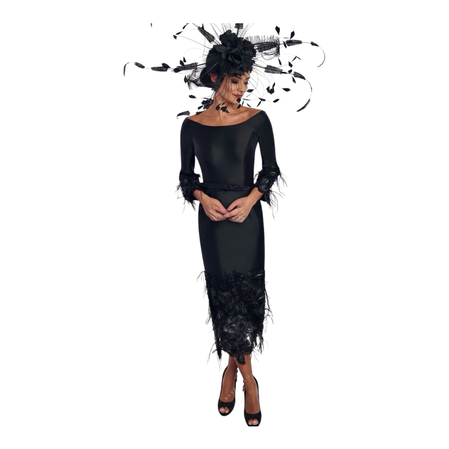 A refined black midi dress featuring feather trim at the cuffs and hem. The bateau neckline and slim silhouette are enhanced with a belted waist, creating a chic balance of sophistication and playful texture.