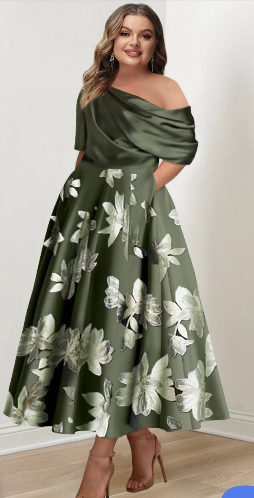 A chic off-shoulder gown in deep olive satin, designed with a draped bodice and flowing A-line skirt. Oversized ivory floral prints cascade across the fabric, creating a statement look that’s both graceful and modern. Side pockets add a contemporary touch.