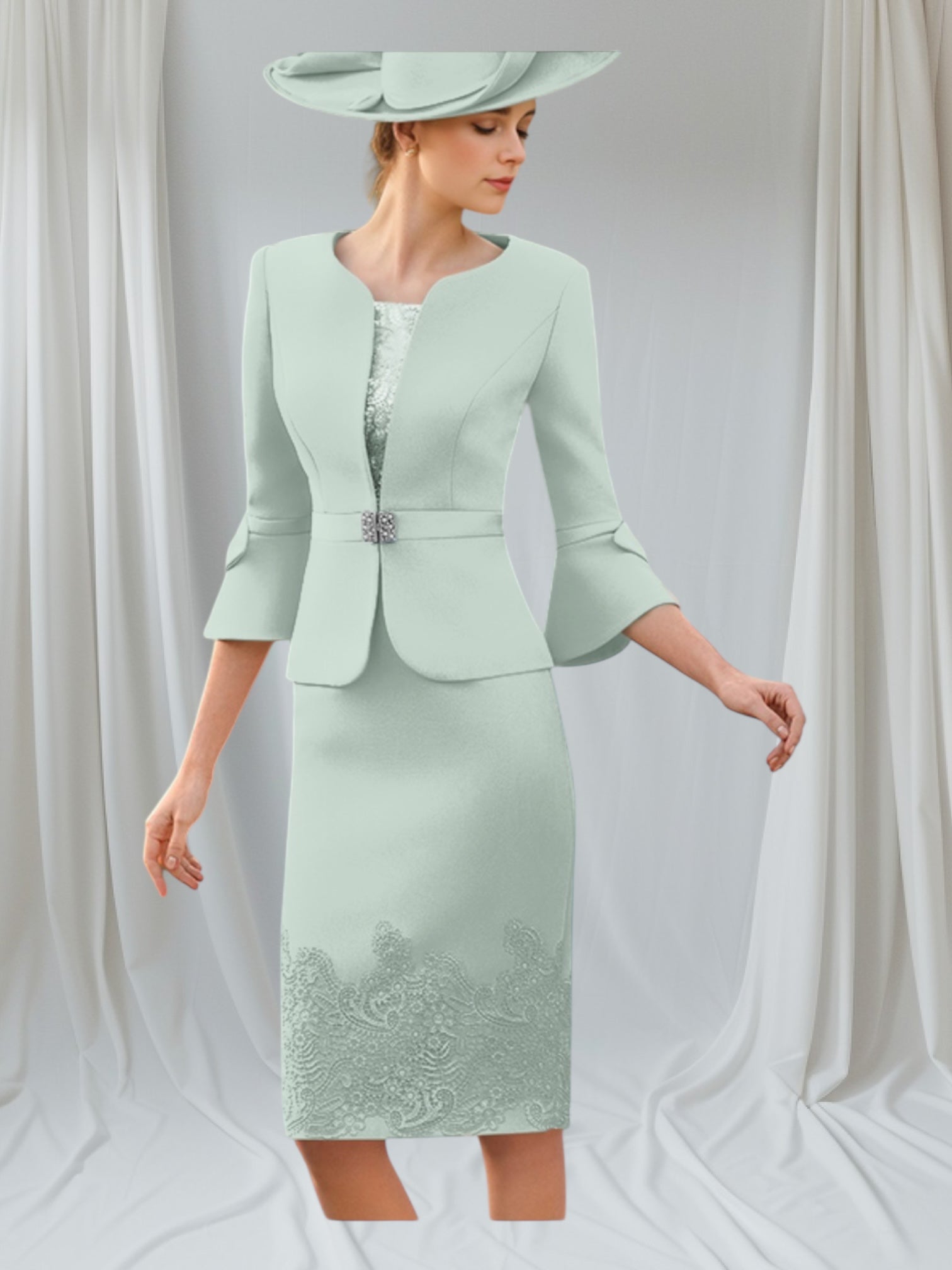 A refined pistachio-toned dress with a tailored jacket overlay, finished with fluted sleeves and a crystal clasp at the waist. Delicate embroidery along the hem adds texture and detail, making this a polished choice for formal occasions.