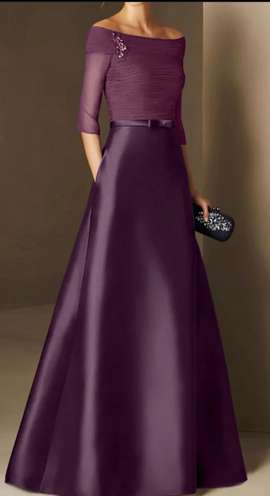 A refined gown in rich plum satin, paired with a ruched off-shoulder bodice and sheer half sleeves. The slim belt cinches the waist while delicate embellishment at the shoulder adds understated sparkle. Graceful and timeless with a contemporary twist.