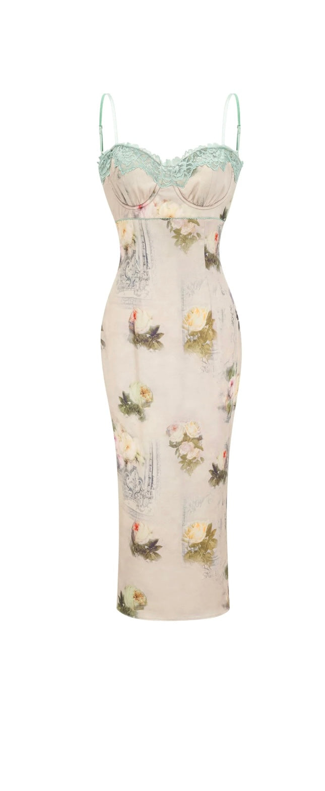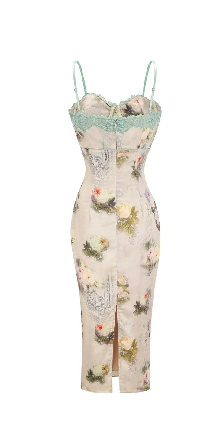 Feminine meets fierce in the Sanne Floral Midi. This curve-contouring silhouette is crafted from a silky floral fabric and finished with mint green lace detailing along the bust for a touch of vintage allure. With delicate straps and structured cups, it delivers lingerie-inspired elegance perfect for romantic dinners, summer soirées, or making an entrance with confidence.