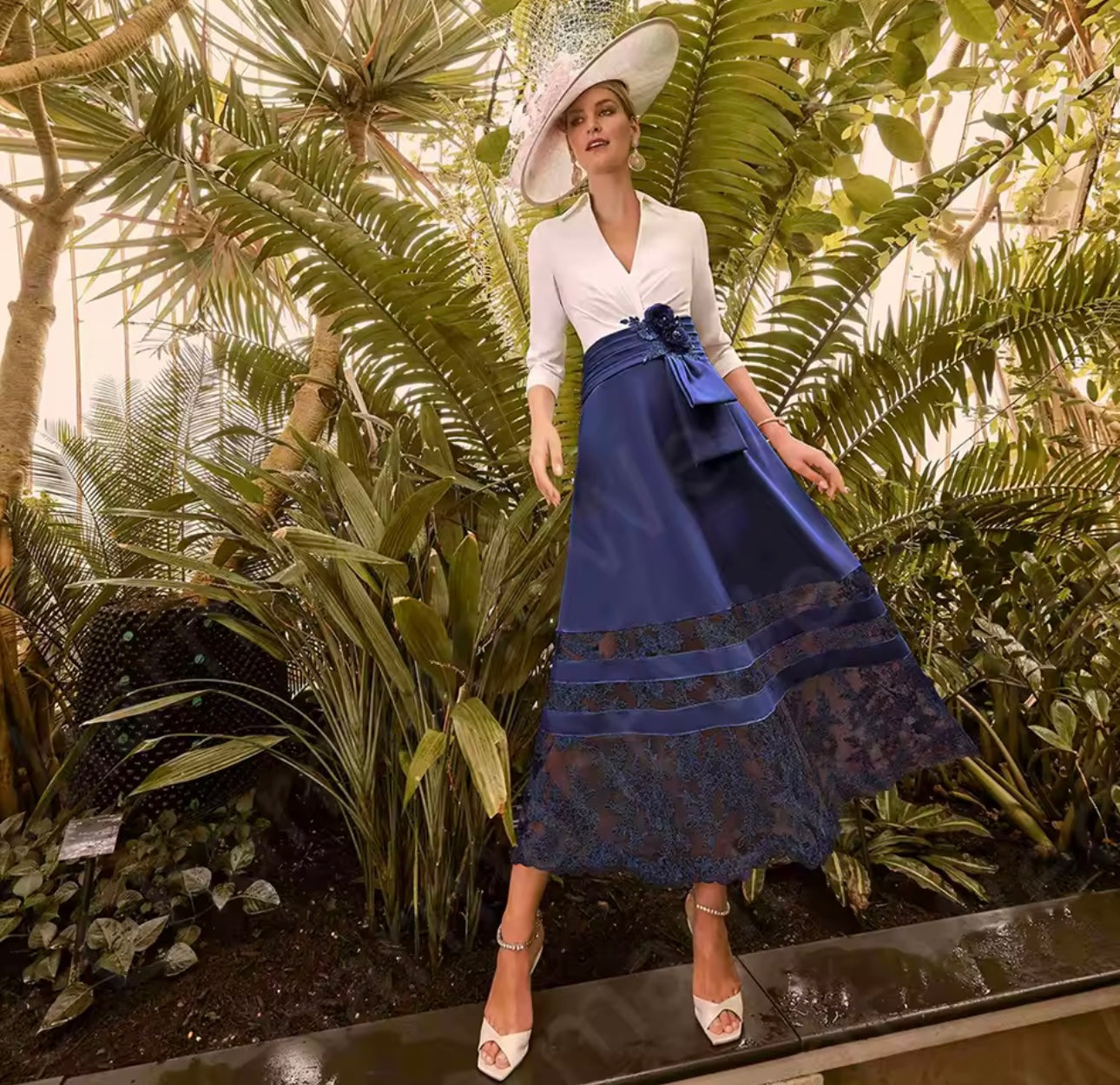 A refined two-tone gown with a crisp white wrap bodice and deep blue A-line skirt. The lace hem adds intricate detail, while a wide sash with floral appliqué defines the waist for timeless charm.