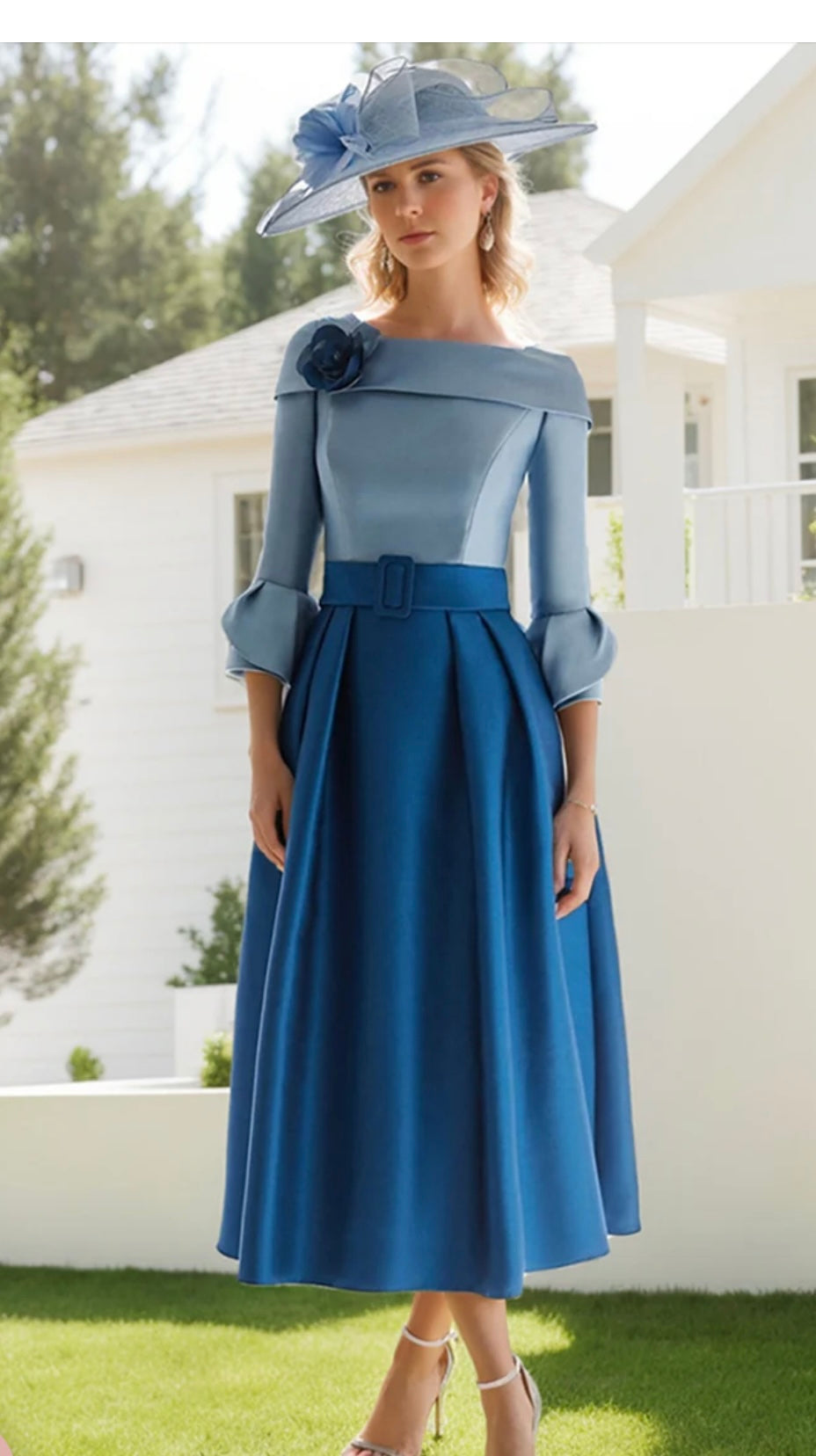 A striking combination of soft sky and deep sapphire blue, designed to flatter with its structured bodice and flowing A-line skirt. The off-shoulder neckline adds sophistication, while the belted waist and floral shoulder detail create a refined finish. Perfectly graceful with a modern edge.