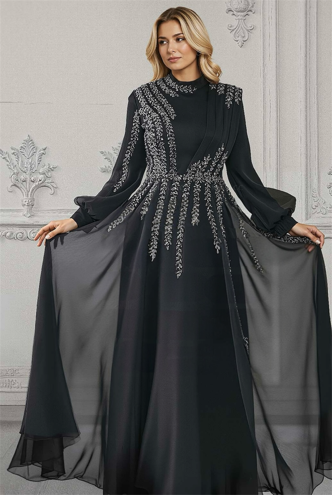 An ethereal black chiffon gown with sheer bell sleeves and intricate silver embroidery cascading down the bodice. The high neckline and flowing layered skirt create a graceful, regal effect.