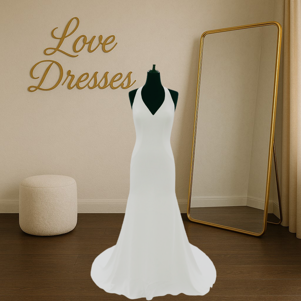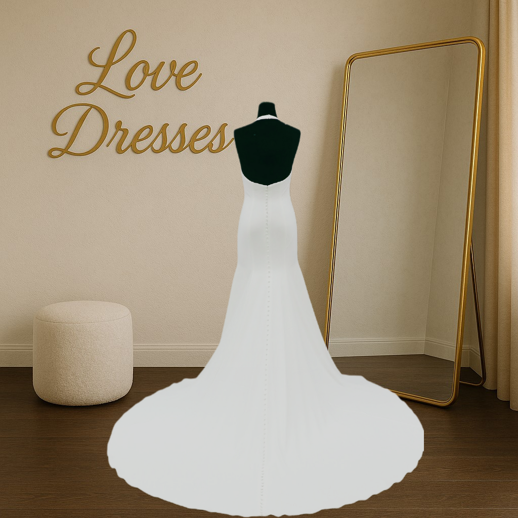right places before flaring gently into a graceful train lined with delicate buttons for a touch of classic charm. Perfect for the bride who values clean lines, refined sophistication, and a silhouette that speaks volumes without saying a word.