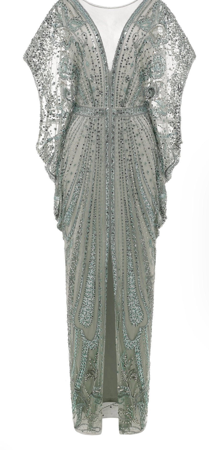 An ethereal masterpiece that shimmers between silver and soft sage, this gown is the definition of understated glamour. The hand-sequinned beaded cape overlay creates fluid movement, while the deep V neckline and tailored silhouette bring a modern edge. The tonal play between silver and sage makes it versatile across different complexions, ensuring a radiant glow in any light. Perfect for black-tie elegance, Mother of the Bride/Groom sophistication, or any moment that calls for a dazzling statement.