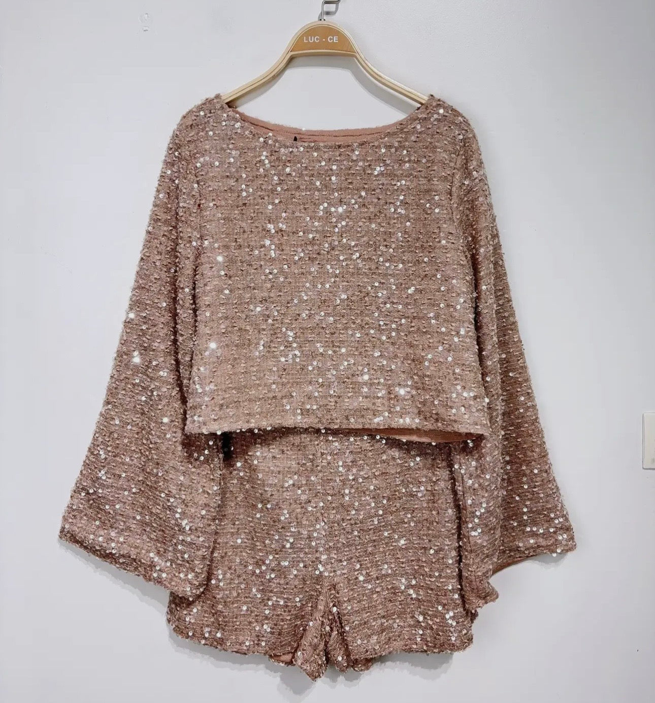 Where cozy meets glam — the Luxe Sequin Co-Ord is the ultimate off-duty party set. Featuring a relaxed sequin-knit top with flared sleeves and matching shorts, it’s effortlessly chic for nights out or festive lounging.
