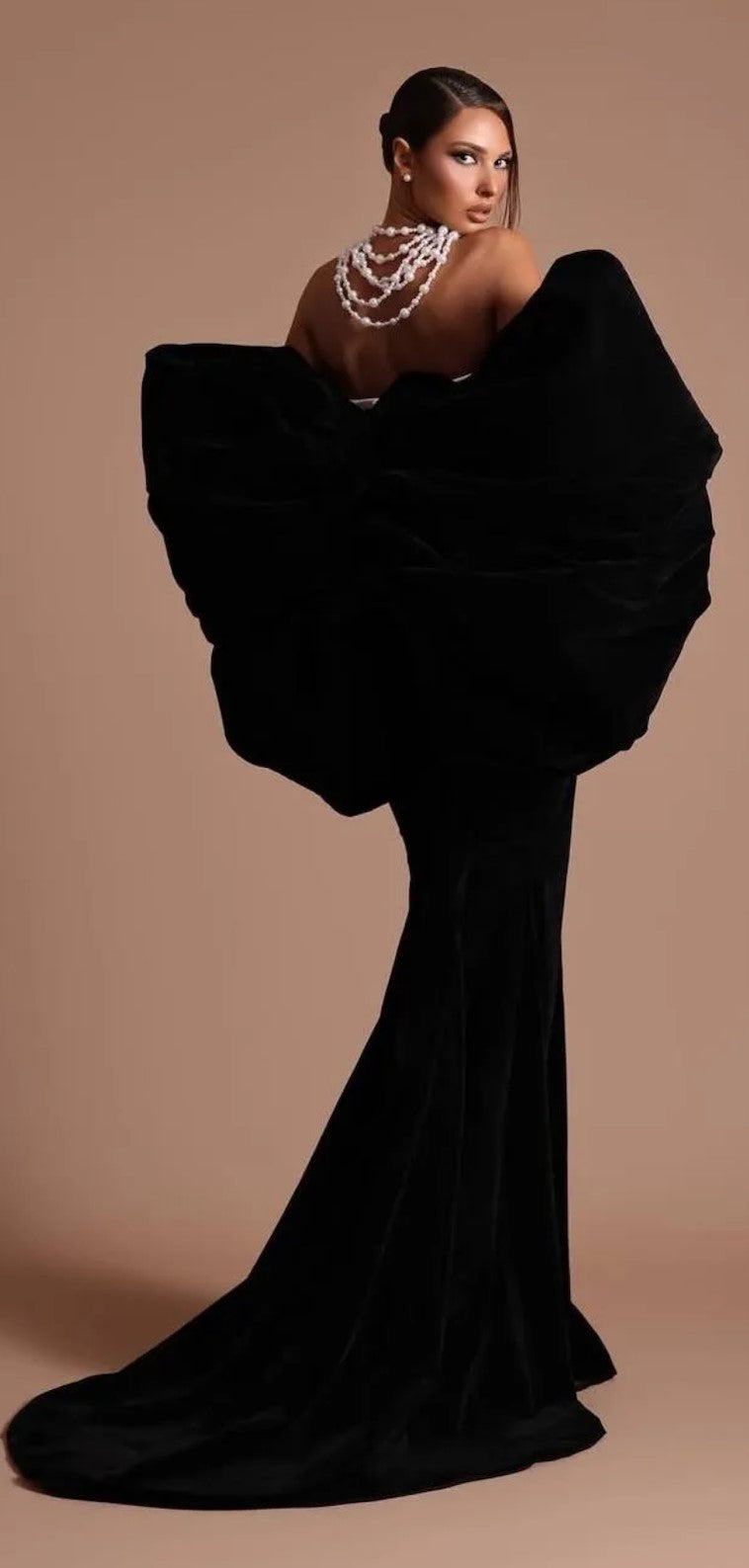 Step into cinematic glamour with The Velvet Heiress Gown — a masterpiece in black velvet and ivory contouring. The sculpted sweetheart bodice meets a floor-skimming silhouette, dramatically finished with voluminous velvet sleeves and a crystal-embellished waist detail. Old Hollywood opulence meets modern-day royalty in this showstopper made for grand entrances only.