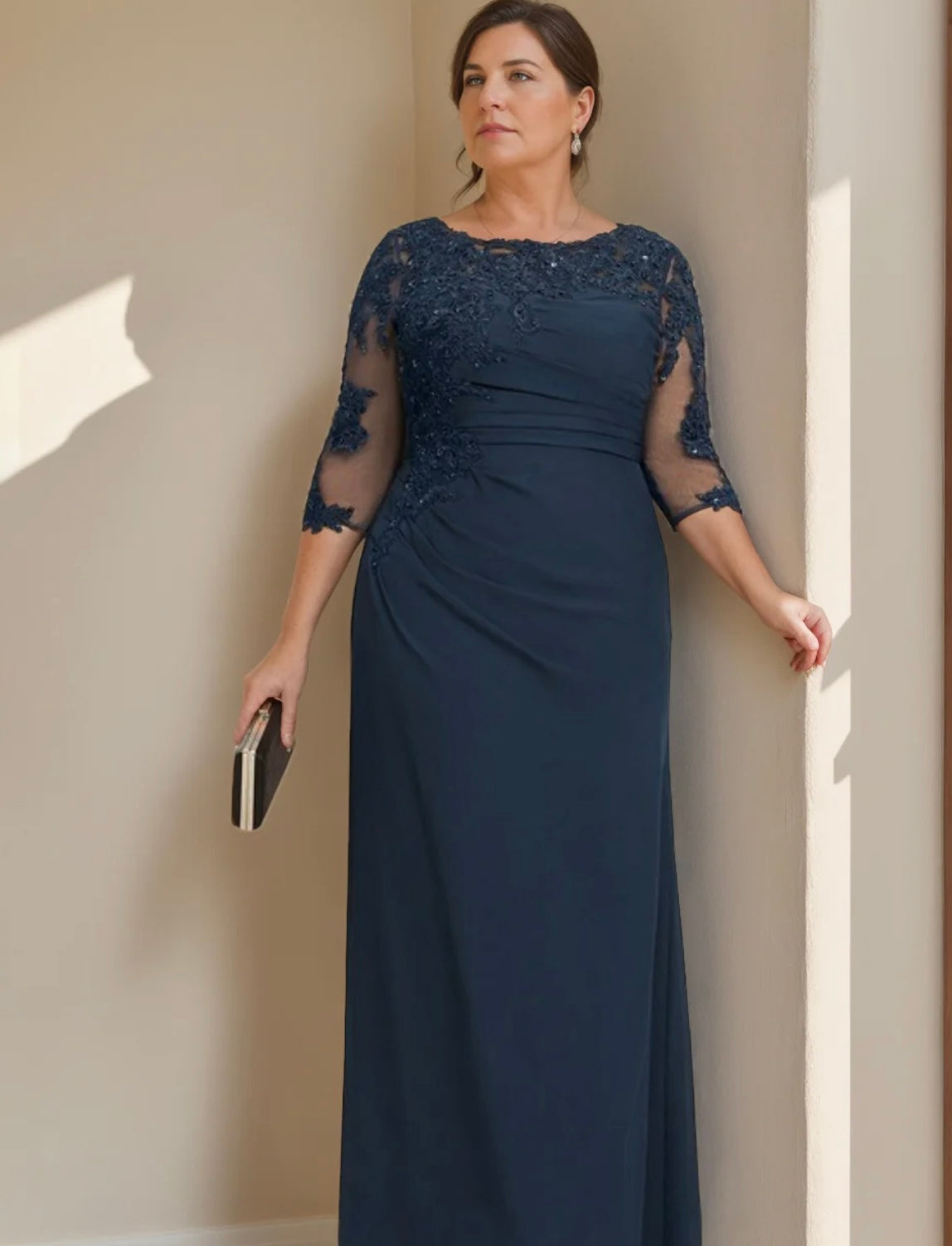 A sophisticated navy gown with illusion lace sleeves and a gently ruched bodice. The semi-sheer embroidered back detail adds refinement, while the straight skirt falls with effortless elegance. Ideal for understated glamour.