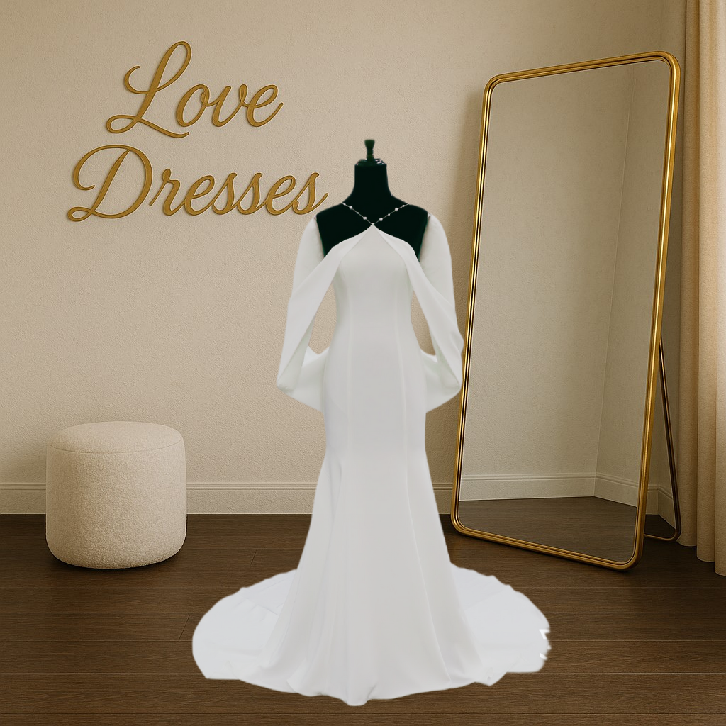 luxurious crepe, this gown features a sleek column silhouette paired with dramatic draped