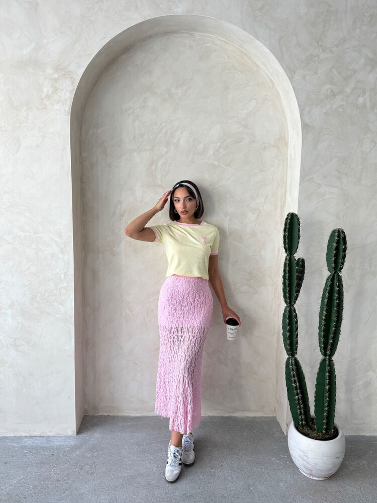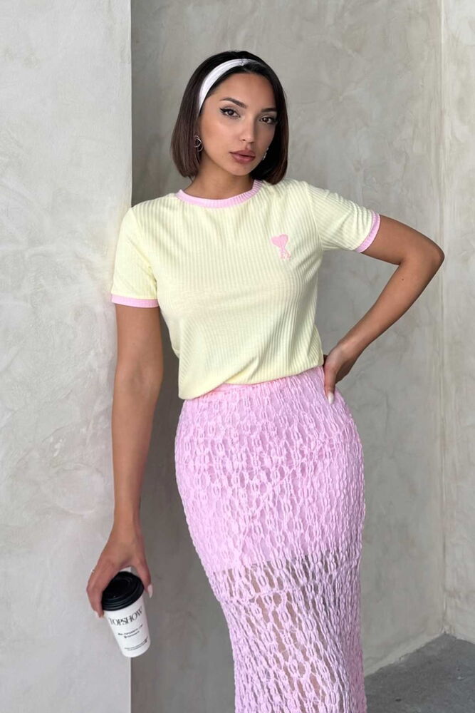 Add a pop of pastel charm to your wardrobe with the Topshow Yellow Embroidered Tee. This soft ribbed t-shirt features a baby yellow base with playful pink trims and a sweet embroidered graphic at the chest. Cute, comfy, and endlessly wearable — pair it with denim, or our pink lace midi, or your go-to mini for an effortless off-duty look.